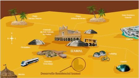 El terreno forma parte del Desarrollo Residencial Premium Nuevo Ebula, ubicado a 6 calles del centro de Izamal y a 9 km de la estación del Tren maya.