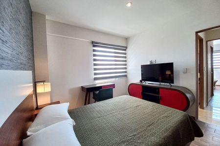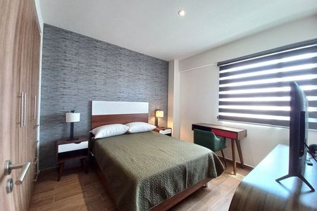 - Habitación principal con cama Queen Size y burós con lámpara, pantalla de 42", amplio closet y baño completo con cancel de vidrio templado.